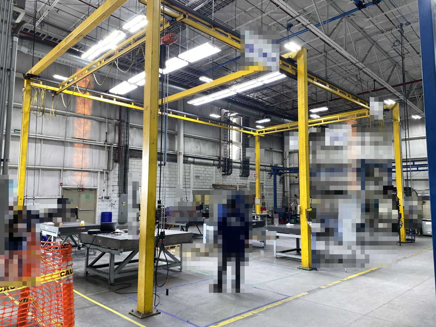 This crane is positioned above CNC work stations in an active manufacturing facility. The freestanding design allows for complete relocation without building structure modifications. All structural components, electrical festoon systems, pendant controls, and hoists are included. Rigging and transportation are not included in pricing.